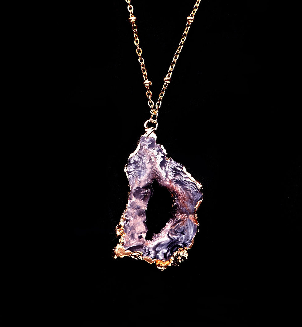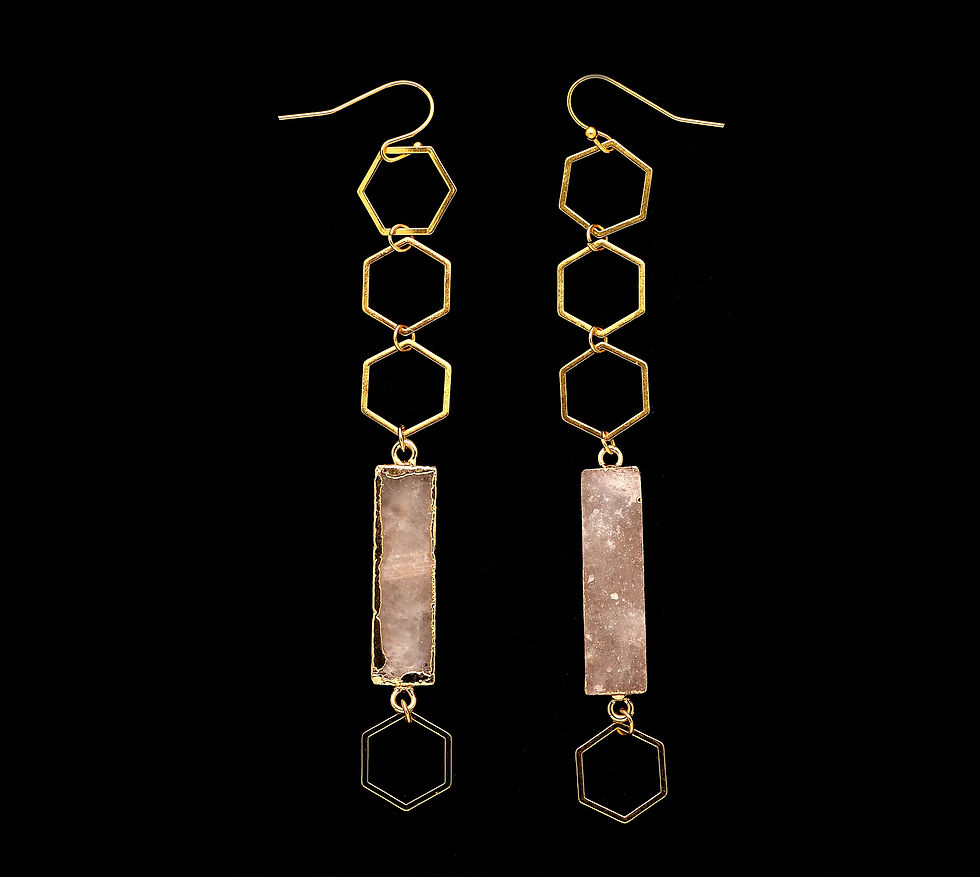 Stainless steel gold hexagon & chain with quartz. Earring hooks are gold platinum. Dress up any look with a boho, classy vibe! Pictured is soft purple, also available in muted yellow, vivid teal, pastel pink, and deep black.